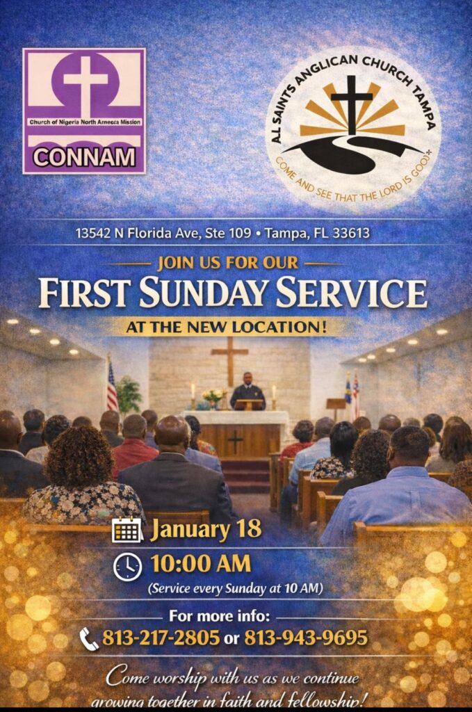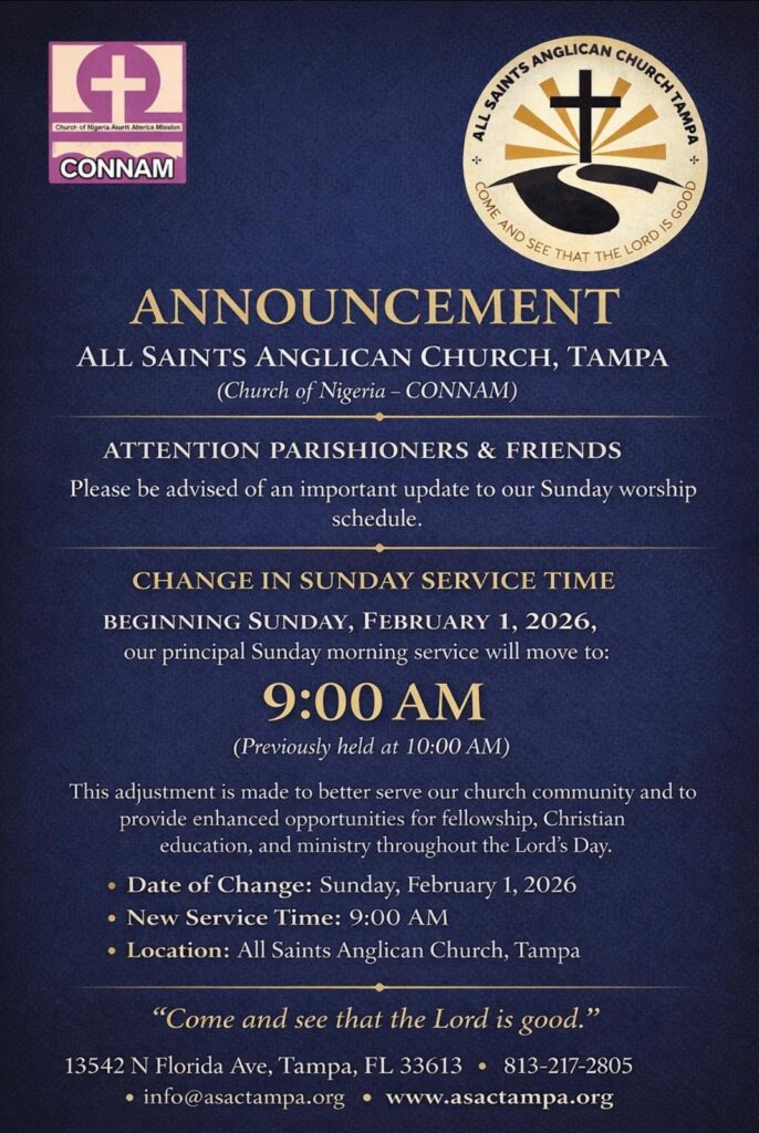 All Saints Anglican Church, Tampa, under the Church of Nigeria – CONNAM, has announced an important update to its Sunday worship schedule. Parishioners and friends are encouraged to take note of this change, which takes effect from Sunday, 1 February →